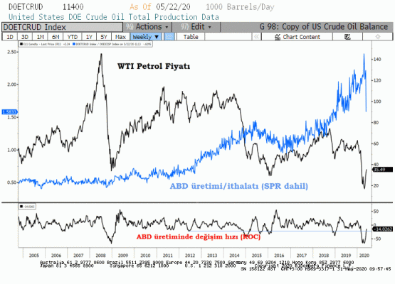 ABD petrol üretimi azalıyor. Uluslararası Enerji Ajansının haftalık petrol raporu, ABD üretiminin azalmasına rağmen ham petrol stoklarının günde 7,9 milyon varil arttığını gösteriyor. Bu durum herhalde üretimden ziyade ithalatın artmasından kaynaklanıyor. Nitekim, ABD petrol üretimi kısa sürede 13,1 milyon varilden 11,4 milyon varile geriledi. Geçen Mayıs vadeli kontrat fiyatlarının negatif fiyatlanması, petrol stoklama tesislerinin yetersizliği endişesi nedeniyleydi. Artık bu tür endişeler ortadan kalktığına göre negatif petrol fiyatı hazin bir hikâye olarak geride kalmıştır ama OPEC+ ülkelerin üretim kısıtlamasına bağlı olarak petrol fiyatı kolayca 30.00 dolar altına sarkabilir