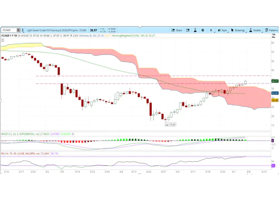 Teknik olarak; OPEC+ anlaşması ve ekonomik görünümün iyileşmesi ardından Temmuz vadeli WTI petrol fiyatı yükselmeye devam edebilir. Zaten uzlaşma beklentileri ile Cuma günü 40.00 dolara doğru ciddi bir yükseliş gözlendi. Teknik olarak 42.00 dolar civarı Mart ayında oluşan boşluk (gap) seviyesini kapatıyor, dolayısıyla bu seviye risk/getiri açısından cazip olmamakla birlikte rafine ürünlerde V şeklinde toparlanma ham petrol fiyatında 50.00 dolara kapı açabilir. Direnç bölgelerinde seyir volatiliteyi desteklemeye devam edebilir ama 40.00 dolar üzerinde yorgunluk ve momentum azalması hızlıca 35.00 dolara gerileyecek satış fırsatı yaratabilir. Kısa dönem göstergeler aşırı pahalı RSI 70 üzerinde, yükselmeye toleransı düşük, MACD henüz satış sinyali vermedi ama 40 bölgesinde oyalanma bu sinyali üretir.