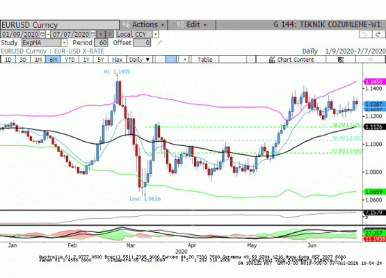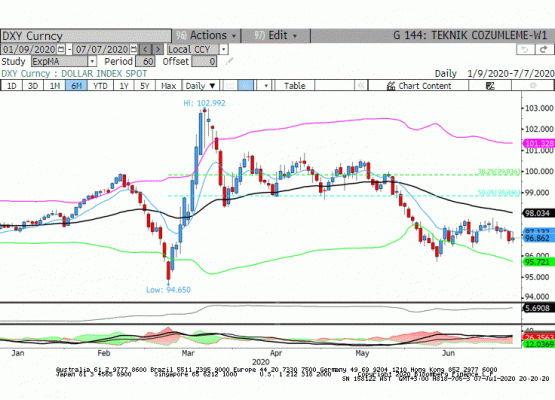 Dolar Endeksi (DXY); Mart ayında döviz piyasasında pandemi fiyatlaması ve küresel çapta artan Amerikan Doları talebi Dolar Endeksini 102.992 yüksek seviyesine taşıdı. Sonrasında Merkez Bankaları önlemleri ve Nisan ayı ile beraber ekonomilerin açılacağı beklentisi ile Amerikan Doları karşısında gelişmiş ülke para birimleri nefes aldı. Bu dönemde Dolar Endeksi 100 seviyesi altına geriledi ve belirli bir bant içerisinde kaldı. Ancak Haziran ayının ikinci yarısında ABD tarafında artan bulaş sayısı DXY'ı 94.650-102.992 yükseliş hareketinin yüzde 61.8 fibo seviyesi olan 97.85 altına taşıdı.