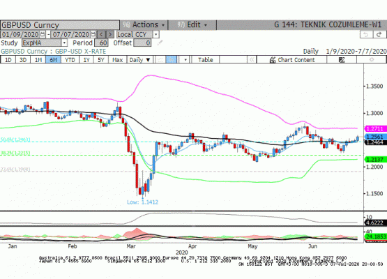 EURUSD paritesi; Geçtiğimiz 1.1300 üzerine yükseliş denemesi yapan ancak bu seviye üzerinde kalamayan euro/dolar bu hafta da Almanya Haziran ayı sanayi üretiminin 7.8 ile (beklenti 11.0) istenilen performansı gösteremeyişi ile 1.1300 altında işlem görmeyi sürdürüyor.Henüz hafta bitmemiş iken şimdiye kadar açıklanan ekonomik verilerde ISM imalat dışı imalat endeksi dolar pozitifdi. Ancak haftalık işsizlik maaşı başvuruları artan covid vakaları ile dolar negatif olabilir. Kısaca haftanın geri kalanında euro/dolar paritesinin bir kez daha 1.1300 üzerini deneme olasılığı sürüyor. Önemli olan bu seviye üzerinde kalınıp daha yüksek seviyeleri deneyecek gücün bulunabilmesi. 30 Haziran tarihli derinlik raporunda CME de fon net uzun pozisyon miktarı -19.493 kontrat düşüş ile 98.955 kontrata geriledi. Döviz piyasasında euro'da limitli yükseliş performansına rağmen CME de fon net uzun pozisyon miktarının yükseldiğini ve 52 haftanın yüksek seviyesinden geçtiğimiz hafta geri çekilme yaşandığını gördük. Derinlik raporu euro'da yükseliş potansiyelinin limitli olduğunu ima ediyor.