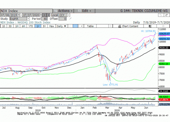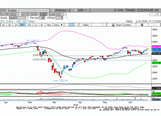 S&P500 Endeksi; Bir yanda ABD tarafında artan virüs vaka sayısı diğer tarafta iyileşen ekonomik veriler arasında kalan endeks temkinli iyimser olmayı tercih etti. Geçtiğimiz haftanın son işlem gününde açıklanan Haziran ayı tarım dışı istihdam verisi 4.8 milyon ile beklenti üzerinde iken işsizlik oranı %11.4'e geriledi. ISM imalat ve imalat dışı sanayi endeksi pozitif iken tüketici ve iş dünyası güveni iyileşiyor. Ancak ülkenin güney batısında artan virüs vaka sayısı ve tüketicinin tekrar içine kapanma ihtimali ile kırılganlıklar olduğunu söyleyebiliriz.