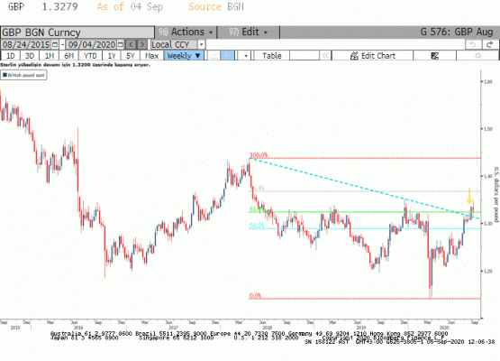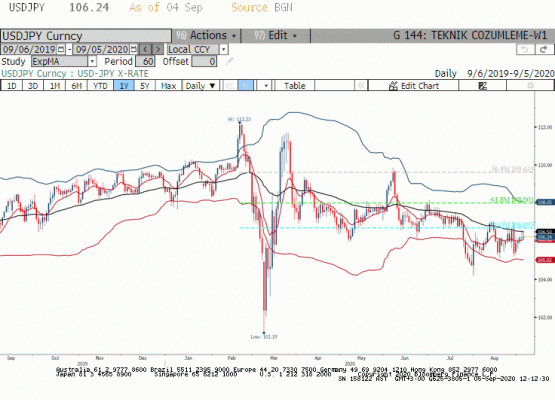 GBPUSD Paritesi: Sterlin tarafında hafta başından itibaren Avrupa Birliği ile başlyacak olan Brexit görüşmeleri takip edilecek. Opsiyon piyasasında EURGBP 2 aylık döngüler ile yapılan işlemlerde son tarih olan 2020 sonuna kadar anlaşma ihtimalinin öne çıktığı görülüyor. Öte yanda Ocak 2020'den bu yana opsiyon işlemcileri Brexit negatif senaryoda Sterlin'de hızlı bir geri çekilmenin Euro'ya kıyasla yüksek ihtimal olduğunu düşünüyor. Opsiyon piyasası anlaşmasız Brexit'in Euro üzerindeki etkisinin limitli olacağı görüşünde diyebiliriz. İngiltere Merkez Bankası (BOE) üyelerinden gelen açıklamada daha fazla parasal genişlemin gündemde olduğunu anlıyoruz. FED'e gelince Başkan Powell geçtiğimiz Cuma günü açıklanan olumlu tarım dışı istihdam raporuna rağmen ekonominin uzunca bir süre düşük faiz ortamını koruyacağı açıklamasını yaptı. ABD tarafında haftanın son işlem gününde açıklanacak olan tüketici enflasyonu veriisnin yıllık bazda %1.2 seviyesine yükselmesi bekleniyor. Ancak FED orta vadeli enflasyon hedeflemesini %2 ortalama olarak güncelledikten sonra enflasyon piyasalardaki etkisini bir nebze kaybetti. Ortalamaya yaklaşmadan döviz piyasası ve finansallar enflasyon fiyatlaması için aceleci olmayacaktır. Amerika için labor day sebebi ile kısa bir hafta olacak. İngiltere tarafında Brexit dışında önemli bir veri trafiği görünmüyor. Ancak Perşembe günü yapılacak Avrupa Merkez Bankası (ECB) toplantısında Lagarde'ın konuşmasında enflasyon ve büyüme konusunda yapılması muhtemel güncellemeler ileriye dönük teşvik beklentilerini de değiştireceğinden önemli olacaktır.