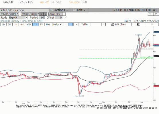 Teknik olarak; Bu hafta 27.15 üzerinde kapanışlar ile piyasanın güçlenemediği senaryoda 11.64-29.85 yükselişinin %23.6 (ilk düzeltme) seviyesi olan 25.55 dolara doğru geri çekilme sürebilir. Küresel piyasaların risk iştahının ciddi boyutta bozulmadığı ortamda 25.55 desteğinin korunacağını tahmin ediyoruz. Satışların derinleşmesi durumunda ise 23.65 ve 22.90 destek olarak takip edilebilir. Yukarıda 27.15 üzerinde 28.30-28.90 aralığına doğru yükseliş denemesi gelebilir. Ancak 29.00 dolar ve üzeri için gümüş piyasasının biraz daha güç toplaması gerekiyor bu da zamana yayılabilir.