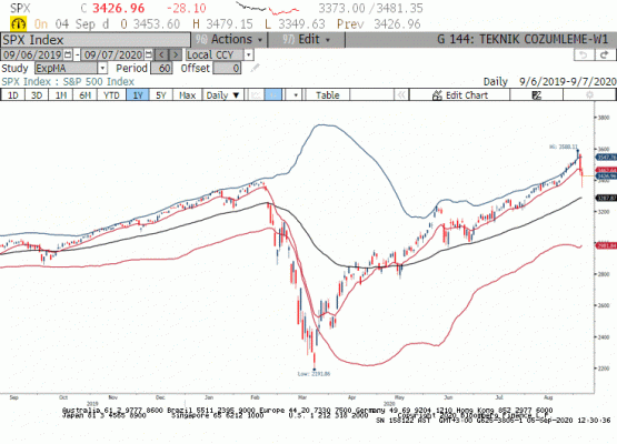 Teknik olarak; 03 Eylül seansında başlayan satışların devamı ile haftanın son işlem gününde endeks en düşük 3349'u gördükten sonra kapanış 3426 seviyesinde gerçekleşti. SPX 12 günlük üssel hareketli ortalama 3462 üzerinde bollinger üst bant 3550 seviyesini tekrar denemek isteyebilir. Öte yanda teknoloji hisselerinde satışın devam ettiği senaryoda 60 günlük üssel hareketli ortalama 3290'a kadar geri çekilmenin süreceğini tahmin ediyoruz. 3290-3255 destek bölgesinin aşağı yönde kırılması durumunda ise 3120 ve 3050 destek olarak görülüyor.