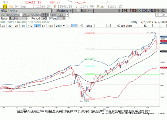 Teknik olarak; 04 Eylül seansında en düşük 11145 seviyesini göre Nasdaq endeksi 11500-11600 seviyesi üzerinde kalabilirse güünü koruyor diyebileceğiz. Bu senaryoda endeks 12 bin trend çizgisi üzerinde 12300'e doğru yükselişini sürdürebilir. Aşağıda 11100 ilk destek iken bu seviye altında 60 günlük üssel hareketli ortalama olan 10.926 kritik önem sahip kırılma 10274 desteğini gündeme getiriyor olacak.