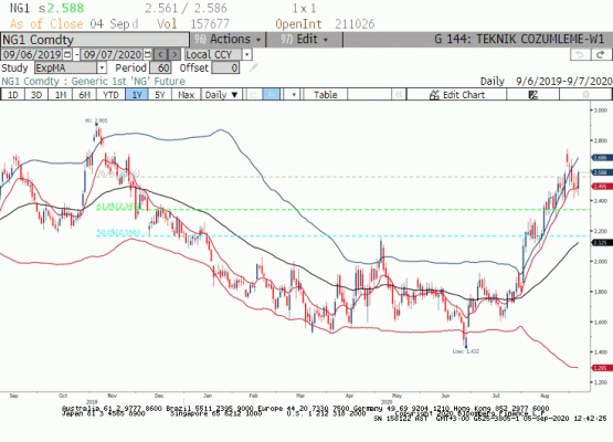 Doğalgaz Piyasası; ABD doğalgaz stokları son 10 sene ortalamasının altına gerilerken Haziran sonundan bu yana doğalgaz fiyatları %61 yükselerek 1.04 dolarlık ralli yaptı. Yükselişin başlangıcı Çin'in Amerika'dan LNG ithalatını artıracağı beklentisine dayanıyordu. Bugünlerde LNG ithalatı da dahil olmak üzere Çin'in kapasitesini doldurduğu yönünde beklenti ağırlık kazanıyor. Önümüzdeki haftalarda yeni bir kasırga beklentisi ile arz tarafındaki endişelerin artmadığı ortamda yükselen fiyatlar ile ABD kaya gazı üretimi yapan firma sayısında artış arzı yukarı çekebilir.