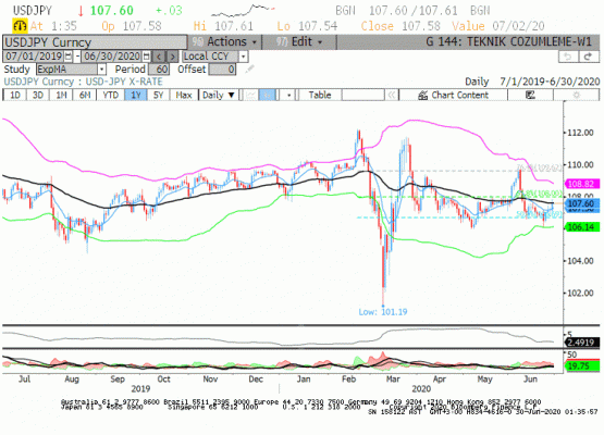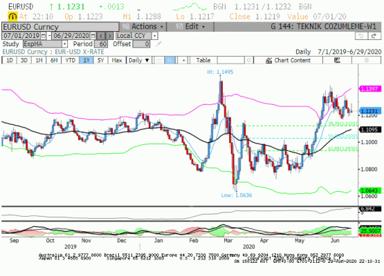 EURUSD Paritesi; Haziran ayı ECB (Avrupa Merkez Bankası) toplantısı ardından bankanın kolay para politikalarından uzun bir süre çıkış yapamayacağı anlaşılınca euro/dolar paritesi geriledi. Haftaya başlarken artan virüs vakaları ve ikinci dalga endişesi ile döviz piyasasında Dolar Endeksi (DXY) güçlenebilir beklentisi vardı. Genel anlamda küresel piyasasaların risk alma konusundaki temkinli tavrına rağmen Dolar Endeksi ilk işlem gününde beklenen hareketi yapamadı. Bu durum İngiltere'nin Avrupa Birliği'nden çıkış görüşmelerine tekrar başlanması, Avrupa'nın covid-19 konusunda Amerika'ya kıyasla kontrolü ele geçirmiş olduğuna dair izlenim ve Lagarde'ın ekonomi için en kötüsü geride kaldı söylemi ile birleşince 29 Haziran yüksek seviyesi 1.1288 olarak gerçekleşti. Bu seviye ardından gelen satış baskısı paritenin henüz 1.1300 üzerine hareket için gücü olmadığını ifade ediyor.