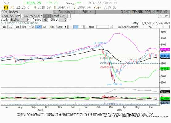Teknik olarak, 60 günlük üssel hareketli ortalama 2.990 altında 3.393-2.191 düşüş hareketinin % 61.8 fibo seviyesi 2.940 destek olarak görülüyor. Bu seviyenin altında 2.800 destek seviyesine doğru geri çekilme sürebilir. S&P500 endeksinin 2.990 seviyesi üzerinde kalması ile 3.074 ara direnç olmak üzere 10-11 Haziran 3.123-3.190 fiyat boşluğu hedeflenebilir. Ancak bu tarz bir hareket için piyasada kenarda bekleyen kurumsal yatırımcıyı alış yönlü pozisyonlanmaya çekecek gelişmeler aranıyor. Son günlerde Amerikan hisse senedi piyasalarında işlem hacminin düştüğü gözden kaçmıyor.