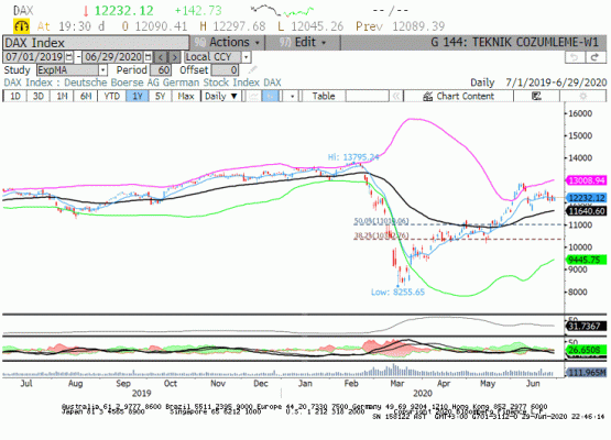 Teknik olarak, Almanya DAX endeksi 12.200 üzerinde 10-11 Haziran fiyat boşluğu 12.223-12.530'nu doldurma kapasitesine sahip görünüyor. 60 günlük üssel hareketli ortalama 11.640 altına geçilmesi durumunda ise piyasanın satıcıların kontrolküne geçtiği söylenebilir. Bu seviye altında 11.000 ve 10.350 destek olarak takip edilebilir.