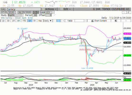 Gümüş (XAG/USD); Eylül 2019'da en yüksek 19.65 sent gören gümüş 2020 yılında kardeş emtia altından aldığı destek ve ekonomik toparlanam beklentileri ile iki kez 19.00 seviyesine doğru hareket yaptı. Ancak bu seviye geçilemedi ve Haziran gümüş için düzeltme ve dinlenme dönemi oldu. Sene başından bu yana gümüş ETF (borsa yatırım fonları) ile yatırımcı ilgisi devam ediyor. Vadeli piyasalardaki fon pozisyonlarının ise bir miktar geri çekilme sonrasında geçtiğimiz iki haftada tekrar artıya döndüğünü görüyoruz. 2008 krizi sonrasında altın ve gümüş fiyatları piyasanın likite dönme ihtiyacı ile bir süre satışlara yenik düşmüş sonrasında hızlı bir yükseliş yaşamıştı. Bu dönemin şartları farklı hem düşüş hem yükseliş 2008 krizine kıyasla daha ılımlıydı. Ancak tekrar bir likidite sıkışıklığı yaşanmadığı ve Dünya ekonomisinin toparlanma eğilimine girdiği pozitif senaryoda aynı zamanda endüstriyel metal olan gümüş piyasasına yatırımcı ilgisi sürebilir.