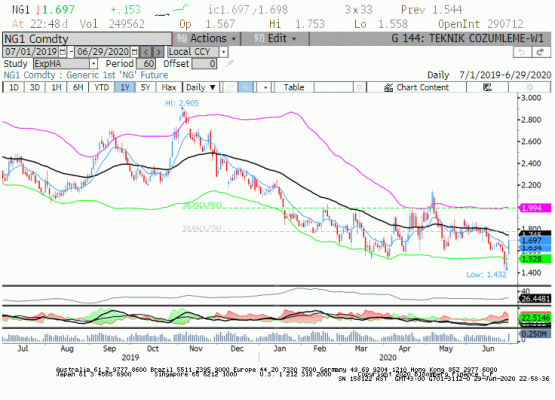 Teknik olarak, dogalgaz piyasasında 1.74 direnç seviyesinin yukarı yönde kırılması durumunda 1.77 test edilebilir. Bu seviyenin yukarı yönde kırılması 1.99'a doğru hareketin önünü açacaktır. Yüksek fon net kısa pozisyon miktarı ve hızlı bir short covering ile bugün kü yükselişin devamı da sert olabilir. Ancak mevcut arz/talep koşulları ile yükselişin kalıcı olması zor ve bu hareket henüz orta vadeli alım yönlü stratejileri desteklemiyor. Dünkü tepki alımları ardından tekrar satıcıların kontrolü durumunda ise 1.63-1.60 ve nihayetinde BB alt bant 1.53 destek olarak takip edilebilir.