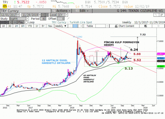 Haftalık bazda beklenmedik bir gelişme olmazsa 5.8448 direnci ile 200 günlük üssel ortalama 5.66 aralığında fiyat hareketi bekliyoruz. Beklentimizi aşan bir fiyat hareketinde 250 günlük üssel ortalamanın geçtiği 5.61 seviyesi dip olabilecek en kritik destek iken, yuakrı yönlü beklenmedik bir hareket ile 5.8448 kırılırsa ekim ayı Barış Pınarı Harekatında test edilen 5.9380 seviyesi takip edilmelidir.