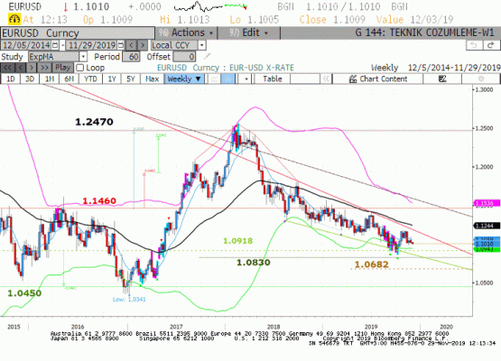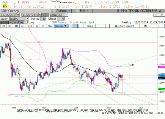 Piyasa ekim ortasında test ettiği 1.30 seviyesinden sonra 7 haftadır 1.27-1.30 aralığında konsolidasyon eğilimi izliyor. Ancak anlaşmasız brexit olasılığının azalmasından sonra oluşan 1.20-1.30 hareketi ile ana trend şorta vadede yukarı yönlü gelişmektedir ve kritik önem arz ettiğini düşündüğümüz 1.27 üzerinde görülen her geri çekilmeyi piyasa muhtemelen tekrar alım için değerlendirecektir. Ancak 2020 ocak sonuna uzayan Brexit süreci ve 12 aralıktaki erken seçim belirsizliği sebebiyle piyasa bir süre daha konsolidasyon eğilimi izleyebilir.