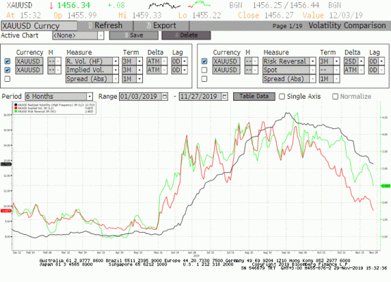 Altın ons call-put prim farkı(Risk Reversal yeşil çizgi grafik) geçen hafta sert biçimde gerileyerek kaısm ayı en düşüğüne geriledi. Dolayısıyla Altın için opsiyon piyasalarında da aşağı yönlü beklentilerin arttığını söyleyebiliriz.