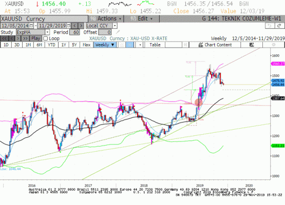 Teknik açıdan omuz baş omuz formasyon hedefi 1430 ve 200 günlük üssel ortalamanın geçtiği 1418 usd seviyelerinin oluşturduğu destek bölgesine kadar satış gelmesini bekliyoruz. 1430-1418 seviyeleri uygun stop loss marjları ile long pozisyon almak için uygun seviyeler olarak görünmektedir. 12 haftalık üssel fiyat ortalaması 1474 hafta içinde takip edilecek en önemli dirençtir.