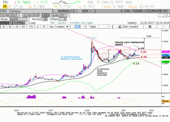 Haftalık bazda beklenmedik bir gelişme olmazsa 5.8448 direnci ile 200 günlük üssel ortalama 5.67 aralığında yoğunlaşan fiyat hareketi bekliyoruz. Beklentimizi aşan bir fiyat hareketinde 250 günlük üssel ortalamanın geçtiği 5.60-5.62 seviyeleri dip olabilecek en kritik destek iken, yukarı yönlü beklenmedik bir hareket ile 5.8448 kırılırsa ekim ayı Barış Pınarı Harekatında test edilen 5.9380 seviyesi haftalık direnç olarak takip edilmelidir.