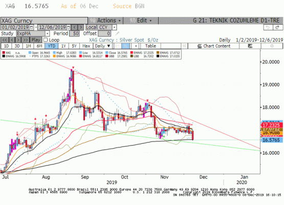 Geçen hafta cuma günü 200 günlük üssel ortalamanın geçtiği 16.57 seviyesinde kapanış yapıldı. Teknik olarak 16.57-16.43 usd detsek bölgesi önemli. Bu seviyelerden tepkisel alım gelebilir. Ancak kırılması halinde yıl içinde çift tepe formasyonu görülen ve artık kuvvetli destek konumuna geçen 16.21 usd seviyesine kadar gerileme görülebilir. Haftalık bazda yükselişlerde ise 17.36 usd seviyesinin kuvvetli direnç olmasını bekleriz. 17.36 altında devam eden fiyatlamalarda orta vadeli trendin aşağı yönlü geliştiğine dikkat edilmelidir.