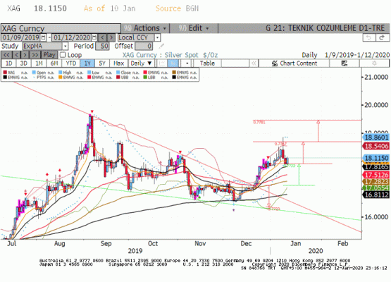 Teknik açıdan 17.91 usd üzerinde eğilim yukarı yönlü gelişmeye devam ediyor ancak 17.91 kırılırsa düzeltme süreci ile 50 günlük üssel hareketli ortalama 17.51 usd seviyesine kadar gerileme görülebilir. 17.51 hafta içinde takip ettiğimiz kritik bir destektir. 17.91 üzerinde devam eden seyirde yukarı yönlü ise 18.65 önemini koruyan çok kritik bir direnç olmaya devam edecektir. 2017 yılından beri güncelliğini koruyan bu direnç kırılırsa 19.47 usd seviyesine hareketlenme bekleriz.