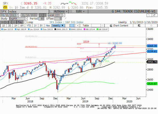 ABD-İran arasındaki gerilim ve hafta içinde güvenli liman varlıklarında görülen sert alımlara rağmen S&P 500'deki yükseliş trendi gücünü korudu. Piyasanın savaş korkularına rağmen bir düzeltme hareketi göstermemesi ve üstelik 3283 seviyesinde yeni bir tepe test etmesi boğa piyasasının gücünü kanıtlıyor. Genel olarak FED'in destekleyici para politikası, 1.faz anlaşmanın imzalanacağı beklentisi ve global ekonomiye ilişkin resesyon korkularının azalması S&P 500'de yukarı yönlü trendin devamını sağlıyor.