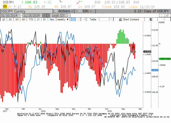 15 kasım tarihli son COT raporuna göre fonlar JPY'deki net spekülatif short pozisyonlarını artırmaya devam ediyor. USDJPY risk reversal(call-put prim farkı) da geçen hafta yükseldi. Dolayısıyla piyasa hissiyatı göstergeleri yen tarafında değer kaybının devam edeceğine işaret etmektedir.
