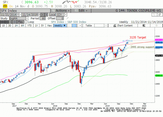 Haftalık grafikte kırılan yükselen üçgen ve günlük grafikte geçtiğimiz haftalarda kırılan yükselen kama formasyonlarının hedef seviyesi 3135'dir. Cuma günü yapılan 3120 kapanışı ile bu seviyeye yaklaşıldı. Teknik formasyon hedefi kırılma sonrasında 3135'den satış gelebileceğini düşünüyoruz. Ancak kırılması durumunda 3212 seviyesi yeni hedef olacaktır. Haftalık bazda beklediğimiz minimum seviye ise 3064 desteğidir.
