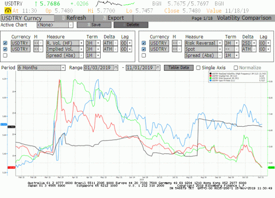 Ancak 5 yıllık CDS primi aşağıdaki grafikten görülebileceği gibi geçen hafta da gerilemeye devam etti. Yine ima edilen(implied) oynaklık oranı da 1 ve 3 aylık vadeli opsiyonlarda gerilemeye devam ederek risk algısında iyileşmeye işaret etmektedir. Bu göstergeler çerçevesinde Dolar TL'de yataya yakın satıcılı eğilimin devam etmesini bekliyoruz.