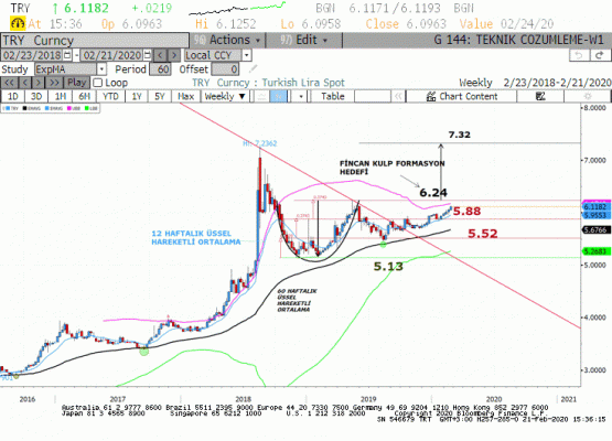 Teknik açıdan 6.24 seviyesi fincan kulp formasyonu içinde yükseliş trendini destekleyen temel gerekçelerle trendin hedefi olarak görünmektedir. Haftalık bazda 6.18-6.24 kuvvetli dirençler iken, geri çekilmelerde 6.05-6.0250 seviyeleri hafta boyunca destek olarak çalışabilir. 6 lira ise psikolojik destek iken 5.95-5.90 haftalık bazda dip olabilecek kuvvetli desteklerdir.
