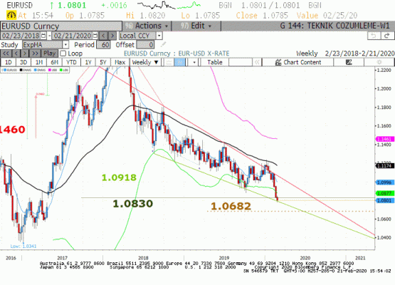 Çin kaynaklı endişeler azalmadığı sürece Euro'da satıcılı eğilim devam edebilecektir. Virüs endişeleri ortadan kalkar ve/veya Çin tarafından büyük bir ekonomik teşvik paketi gelirse Euro'da ciddi bir toparlanma görebiliriz. Ancak böyle bir durum oluşmadığı sürece trendin kuvvetli biçimde hem kısa hem de orta uzun dönemli zaman aralığında aşağı yönlü geliştiğine dikkat edilmelidir.