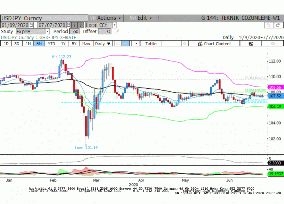 USDJPY Paritesi; Temel olarak büyüme ve faiz oranı farkından ziyade bu dönemde hangisi piyasanın güvenli sığınagı ona bakmak gerekiyor. Japon Yeni Amerikan Doları karşısında en güçlü durabilen para birimi oldu. 30 Haziran haftasının derinlik raporunda fonların CME de Japon Yeni net uzun pozisyon miktarı 3.597 kontrat azalarak 23.681 kontrata geriledi.Son bir haftada fonların Japon Yeni net uzun pozisyon miktarında azalışa gittiği görülüyor. Bir başka önemli gelişme son bir haftada Uzakdoğu ülkeleri para birimlerinin Amerikan Doları karşısındaki güçlü seyri oldu. Bu durum Cuma günü Singapore seçimleri, virüs ile mücadelede Amerika'nın tam anlamı ile kontrolü sağlamamış olması gibi sebeplere bağlanabilir. Ancak daha ziyade kısa vadeli bir tepki olarak görünüyor.