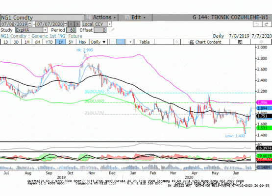 Teknik olarak, Önemli gördüğümüz 1.77 seviyesinin yukarı yönde kırıldı ve 12 günlük üssel Hareketli ortalama 60 günlük üssel hareketli ortalamayı yukarı yönde kesmeye hazırlanıyor. Kısa vadede 60 günlük üssel hareketli ortalama 1.75 üzerinde 1.99 hedef olarak görülüyor. Doğalgaz fiyatları son 10 gün içinde 1.43 seviyesini görmüş iken tepki ile görülebilecek seviye olarak 1.99 görünüyordu. Artan talep desteği ile 2.90-1.43 düşüş hareketinin %50 fibo seviyesi ve aynı zamanda 05 Mayıs yükseği 2.16 hedeflenebilir.