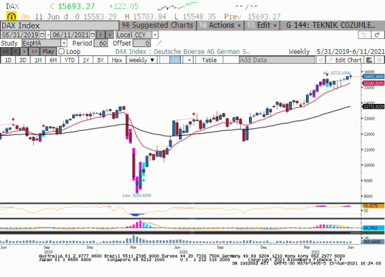 Hafta boyunca yaşanan dalgalanmalar ile Alman DAX endeksi önceki haftaki seviyelerini koruyarak 15693 seviyesinde kapanış yaptı. Geçtiğimiz hafta yapılan ECB toplantısında Merkez Bankası güvercin politikalara devam diyerek beklentiyi karşıladı. Yılın üçüncü çeyreğinde Avrupa Bölgesinde ekonomik büyümenin zirve yapacağı beklentisi var. ECB’nin 2021 yılı GSYIH artışı beklentisini %4,0’ten %4,6 güncellemiş olması bu anlamda pozitifti. Öte yanda bu hafta Çarşamba günü yapılacak FED toplantısı sonrası küresel hisse senedi piyasasının hareketi Alman DAX içinde belirleyici olacaktır. S&P500 endeksi bankacılık sektörünün desteğini kaybedebilir ancak Nasdaq teknoloji hisse senetleri için pozitif haberler var. Yaz aylarına 51 haftanın yüksek seviyesinde uzun pozisyon miktarı ile giren S&P500 endeksi yeni yüksek seviyelere gidecek gücü bulabilecek mi? Yoksa mevcut rekor uzun pozisyon miktarı mevsimsel etki ile yerini kar alma eğilimine bırakacak mı? Bu sorunun cevabı son aylarda ABD hisse senedi piyasası ile korelasyonu arta DAX için de belirleyici olacaktır. Mayıs ayının düzeltme ile geçiren Alman DAX endeksi küresel risk iştahının sürdüğü ortamda 15700 üzerinde haftalık grafikte bollinger üst bant 16100 seviyesine doğru yükselişini sürdürebilir.