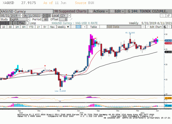 Cuma günü yaşanan %0.25’lik geri çekilmeye rağmen gümüş fiyatları haftayı yaklaşık %.45 yükseliş ile kapadı. Cuma günü dolardaki artış, gümüş ve tüm değerli metaller kompleksi için ters rüzgârlara neden oldu. Öte yanda yaz ayları için milat olarak görülen 16 Haziran FED toplantısı sonrasında yüksek enflasyon seviyelerinden etkilenmeyen getirilerle, daha düşük getirilerin dolar üzerinde baskı oluşturması eninde sonunda gümüş fiyatlarında yükselişe destek verebilir. 16 Haziran’ı beklerken dar bir işlem aralığı içinde kalan fiyatlama ile konsolide olan piyasada bu hafta 27 dolar üzerinde kalınabildiği senaryoyu yorumlarken opsiyon piyasasına dikkat çekmek istiyoruz. Opsiyon piyasasında para yöneticileri yüksek açık pozisyon taşıyor. Piyasa fiyatlaması 27.0 dolar üzerinde %4 civarında bir yükseliş daha yapabilir ise ek kısa pozisyon kapama faaliyeti görebiliriz. Bu durum yükselişe momentum kazandıracaktır.