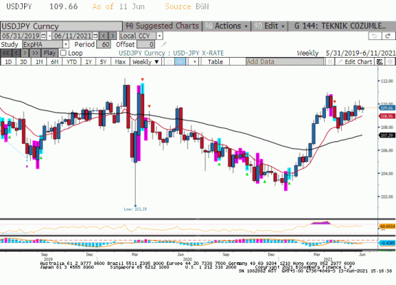 Son haftalarda dalgalı bir seyir gözlenen USDJPY paritesinde önemli olan 111.00 seviyesini yukarı yönde kıracak momentumum yakalanma potansiyeli diyebiliriz. Paritenin 111.00 üzerine çıktığı senaryo yükseliş trendinin devamını teyit edecektir. Geçtiğimiz hafta kazançlar ve kayıplar arasında dönüşümlü olarak büyük ölçüde hareketsiz bir şekilde tamamlandı. Sene başından bu yana yükseliş eğiliminde olan parite Nisan ayının başlarında zirveyi keşif ettikten sonra devam eden aylarda geri çekilmeye tanık oldu. Sonrasında paritenin arada kayıplarını geri alma girişimlerine tanık olduk. Yaz aylarına girilirken 16 Haziran FED toplantısı ardından döviz piyasasının sakin bir döneme gireceğini biliyoruz. Bu dönemde altta 108.00 üstte 111.00 piyasanın işlem aralığı olabilir. USDJPY aralığın tam ortasında ve her iki yöne de hareket edebilir.