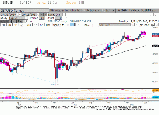 Geçtiğimiz hafta Perşembe günü yapılan ECB toplantısında ekonomide aşağı yönlü risklerin devamı gerekçesi ile Merkez Bankası güvercin duruşu korudu. Banka Haziran ayı toplantısında 2021 enflasyon tahminini %1.5’ten %1.9’a çekerken büyüme beklentisini %4.6 olarak yukarı yönlü güncelledi. Bir gün sonrasında bölgede politika yapıcı rolü ile öne çıkan Klaas’ın para politikası etkisi limitli kaldığı için yıllar boyu esnek mali politikalara ihtiyaç duyduğu söylemi basında yer aldı. Aynı dün ABD Mayıs ayı enflasyon rakamının yıllık %5 ile son 13 yılın en büyük sıçramasını yaptığı ortamda Dolar Endeksinde geri çekilme ile sepet para birimlerinde yükselişi açıklarken FED ’in söylemlerine güven duyan piyasa fiyatlaması vardı. ABD tüketici enflasyonu Perşembe günü tahminlerin üzerinde gelse de, yatırımcılar Fer’in enflasyondaki herhangi bir artışın geçici olacağı ve parasal teşviki azaltmayı tartışmak için çok erken olduğu iddiasına katılarak fiyatlama yapmayı tercih etti. Ancak Cuma günkü ABD Doları'ndaki yükseliş, Fer’in Ağustos veya Eylül'de devasa tahvil alım programını azaltmak için bir strateji açıklayacağına inanan ve varlık alımlarında kesintiye gideceğini düşünen yatırımcıların sayısının arttığını gösteriyor. Haftayı 1.2109 seviyesinde kapatan Euro/dolar paritesinde ana trend düşüş eğiliminde iken bu hafta 1.1985-1.2250 işlem aralığının bir yönde kırıldığı senaryoda parite yaz ayları için yön tayinini yapmış olacak.