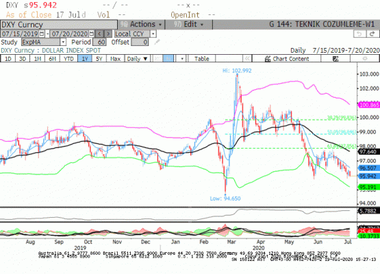 Dolar (DXY) endeksi; Amerika'da geçtiğimiz hafta Perşembe günü 75 bin olan yeni corona virüs vaka sayısının Cuma günü rekor yüksek seviyede olduğu görülüyor. California, Texas ve Florida eyaletlerinde yarı kapalı ekonomi koşullarına karşı New York eyaleti 4. aşama ile ekonomisini açıyor. Dünya genelinde covid-19 vaka sayısı 14 milyona ulaşırken İspanya, Avustralya, Hindistan ve Brezilya son dönemde artan bulaş sayısı ile anlılyor. Artan virüs vaka sayısı ve aşı çalışmalarında son aşama için zaman ihtiyaç olduğu gerçeği ile rezerv para birimi olan Amerikan doları bu dönemde geçici olmakla beraber değer kazanabilir.