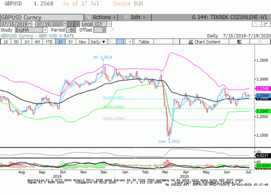 GBPUSD paritesi; İngiltere Merkez Bankası (BOE) Başkanı Bailey'in son açıklamaları üzerinden gidersek; Yılın geri kalanı için beklenen ekonomik toparlanmaya ilişkin beklentilerin net olmadığını anlıyoruz. İkinci çeyrek için beklenen ekonomik daralma %23 ila %25 arasında iken BOE'ın bütçe yükümlülükleri için yaptığı 3 senaryo için 2020 yılında daralma %10 olarak alınmış. Banka 06 Ağustos tarihinde yapacağı toplantıda 2020 ve sonraki iki seneye ilişkin ekonomik beklentilerini güncelleyecek. İngiltere ekonomisi ne hızda toparlanır sorusunun cevabı ise işgücüne katılımın artmasının yanında yiyecek içecek ve perakende sektörü satışlarındaki tüketim eğilimine bağlı iken henüz konaklama ve eğlence sektöründe beklenen kıpırdanma gerçekleşmedi. Önümüzdeki aylarda virüs vaka sayısı ve sağlık sektöründe mücadele başarısına bağlı olarak BOE'ın negatif faiz ortamına geçebileceği beklentisi var. Bu duruma İngiltere'nin yılsonuna kadar Avrupa Birliği'nden çıkış için yapacağı görüşmeler ve anlaşmasız Brexit ihtimali eklenince Sterlin de yükseliş denemeleri başarılı olamıyor.