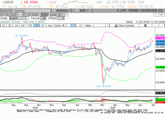 Teknik olarak; XAGUSD paritesinde 12 günlük üssel hareketli ortalama 18.80 dolar üzerinde bollinger üst bant 19.80'e doğru yükseliş yaşanabilir. 13 Temmuz seansında fiyatlar BB üst bant denemesi yapmaya çalıştı ancak başarılı olamadı. Bu hareketin ardından gümüş piyasasının bir miktar güç toplamaya ihtiyaç duyduğu anlaşılıyor. 18.50-19.20 aralığı içerisinde hareket bu beklentimizi karşılar. Aksi, 18.50'in aşağı yönde kırılması durumunda ise 60 günlük üssel hareketli ortalama 17.50 önemli destek olarak görülüyor.