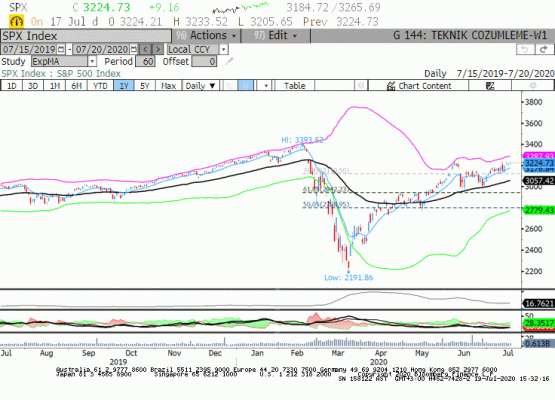 S&P500 Endeksi; Bu hafta Nasdaq içinde açıklanacak Tesla, Microsoft, Intel bilançoları yanında ABD'de kongrede görüşülmeye başlanan teşvik paketi endekste etkili olacak. Paketin büyüklüğü ve içeriği önemli iken Başkan Trump'ın ücretlerde vergi indirimi konusunda ısrar ettiği biliniyor. Temmuz ayı sonu itibari ile istihdam piyasasına olan teşvikler sona eriyor. Dolayısı ile 30 milyonu aşkın işsiz ve son üç ayda verilen ödeneklerin kesilmesi ile ortaya çıkacak tablonın yanında son haftalarda yaşanan geri çekilmeye rağmen her hafta 1 milyonu aşkın işsizlik maaşı başvuruları ile teşvik paketinin karşılamadığı senaryoda hisse senedi piyasalarında aşağı yönlü düzeltme yaşanabilir.