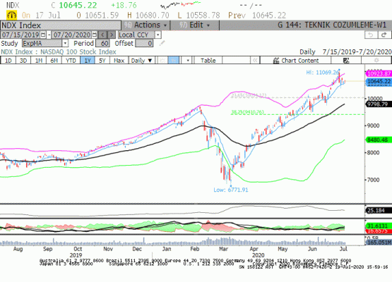 Teknik olarak, 13 Temmuz yükseği 11.069 iken günün kapanışı 10.602 olarak gerçekleşti. Bu tarihten sonra Nasdaq endeksinde yükselişin ivme kaybettiği ve önümüzdeki haftalarda Amerikan endekslerinde yükseliş sürecek ise liderliğin diğerlerine geçeceği beklentisi var. Kısa vadede 12 günlük üssel hareketli ortalama 10.550 destek iken bu seviye üzerinde kalındığı sürece Bollinger üst bant 10.920 ardından 13 Temmuz yükseği 11.069 görülebilir. Satıcıların kontrolü ele geçirmesi durumunda ise aşağıda 10.300 ve 10 bin destek iken 60 günlük üssel hareketli ortalama 9.800 ana destek olarak takip edilebilir.