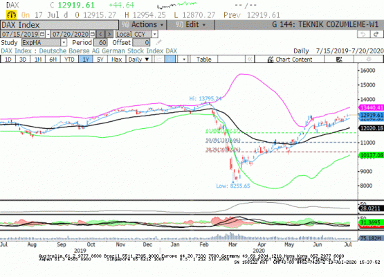 Dax Endeksi; Geçtiğimiz haftadan bu yana küresel endeksin takibinde olanlar covid vaka sayılarının gelişimi, şirket bilançoları ve yeni teşvik paketleri beklentisi olarak özetlenebilir. Bu hafta Avrupa tarafında Almanya ve Fransa öncülüğünde geçmesi beklenen yeni teşvik paketleri ve içeriği takip edilecek. Bunun yanında haftanın son işlem gününde Avrupa Bölgesi Almanya ve Fransa tarafında açıklanacak PMI verileri DAX'ın hareketinde etkili olabilir.
