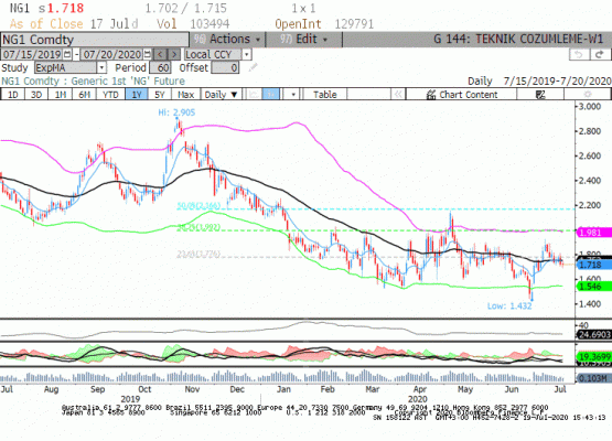 Teknik olarak; Doğalgaz piyasası 07 Temmuz tarihinde görülen 1.92 seviyesi ardından yönünü aşağı çevirdi. Bu hafta fiyatlar 1.75-1.77 direnç seviyeleri üzerine yerleşemez ise 1.65 desteğine doğru geri çekilme mümkün görülüyor. Doğalgaz piyasasında kısa vadeli yükseliş debemelerin başarılı olduğundan bahsetmek için ise 1.98 üzerinde kapanış arıyoruz.