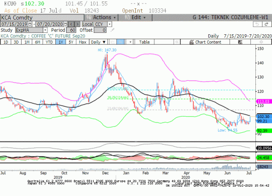 Kahve Piyasası; Kahve piyasasında fiyatlar Haziran ayı dip seviyeleri üzerinde tutunmayı başardı. Brezilya'da rekor üretim arz tarafındaki bolluk Haziran ayı içerisinde fiyatlara yansıdı. Ekonomilerin açılması ve ileriye yönelik talep artışı beklentisi Haziran ortalarında dip yapmış görüntüsü veren piyasaya alıcıları çekebilir. Piyasa dışı değişkenlerinde negatiften pozitife döndüğü ortamda teknik olarak iyileşen görünüm ile kahve fiyatlarının orta vadeli alış yölü stratejilere fırsat verdiğini görüyoruz.