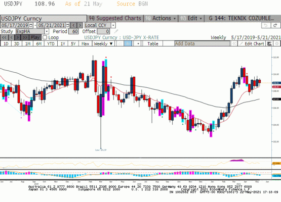 Geçtiğimiz hafta 108.57-109.50 aralığında işlem gören USDJPY paritesinde kapanış 108.96 seviyesinde gerçekleşti. Covid-19 vaka gelişimine bakıldığında ülkenin son 7 günlük ortalamada 650 yani vaka olduğu görülüyor. İhracatçı ülke olan Japonya’da Nisan ayında küresel ekonomik canlanma ile rakamlarda iyileşme pozitif görülüyor. Çin’in çip yapımı için gerekli alet ithalatı ve ABD’nin otomotiv sektörü talebi detayda başı çekiyor. Pandemi etkisinin olduğu dönem ile kıyaslandığında ihracattaki artış göz doldurmayabilir. Ancak iki sene önceki ihracat rakamları ile kıyaslandığında %2.4 artış olması ülkede yılın ikinci çeyreğinde GSYIH rakamını yukarı taşıyabilir. Enflasyon tarafına geçildiğinde 1990’lardan bu yana Merkez Bankası’nın reflasyon çabası ile yapılanlar %2 enflasyon hedefi için fayda etmemiş görünüyor. Ülkede takip edilen enflasyon indikatörü Nisan ayı dahil son 9 ayda fiyatlarda gerilemeyi işaret ediyor. Gıda hariç tüketici enflasyonu Nisan ayında yıllık %0.1 gerilerken kısa vadede BOJ’un ekonomik politikalarda normalleşme sürecine geçmesi hayal diyebiliriz. İhracatçı ülke Japonya ekonomisi yılın geri kalanında iyileşebilir ancak BOF %2 enflasyon hedefinden çok uzakta ve bu koşullarda USDJPY paritesinin yönü büyük ölçüde ABD Doları ve küresel risk alam iştahı ile belirlenecek. Teknik olarak, 200 haftalık üssel hareketli ortalama 108.30 üzerinde kaldığı sürece Japon Yeni değer kazanımları limitli kalabilir.
