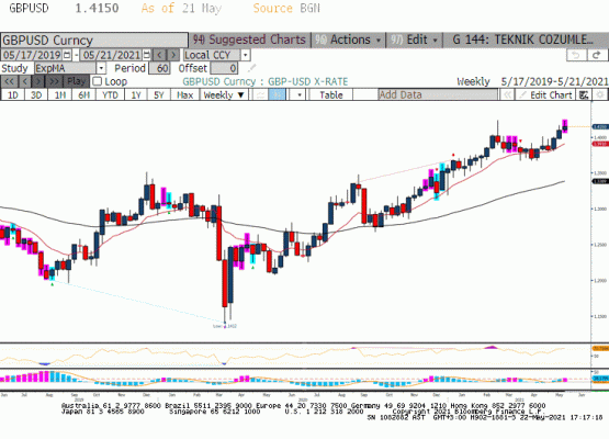 İngiltere tarafında Cuma günü açıklanan Markit PMI imalat ve servis sektör endekslerinde 60.00 üzerinde gerçekleşme ile özel sektörün son 23 yılın en iyi performansını gösterdiği ve perakende satışların yükseldiği görüldü. Servis sektör endeksinde güçlü talep artışı ve fabrika siparişlerinde yükseliş ile iş dünyasının ekonomiye olan güveni arttı. Nisan ayında ülkede online satışların %9.2 arttığı görüldü. Ayrıca tüketici güveninin 2020 Mart ayı seviyesinin üzerine çıkması iyi giden aşılama ve tam açılma ile mümkün oldu. İngiltere yılın ikinci çeyreğinde güçlü GSYIH artışını yakalanan momentum ile yılın geri kalanında koruyabilir. Ülkede 21 Haziran itibari ile kısıtlamaların tamamı kalkacak ve İngiltere Merkez Bankası 1988’den bu yana hane halkı harcamalarının en üst seviyeye ulaşacağını öngörüyor. Bu senaryo için en önemli tehdit olarak Hindistan mutandı olarak görülürken Hindistan’ın Haziran ayı içinde virüs vaka sayısını kontrol altına alabileceği söyleniyor. İstihdam piyasasında veriler beklentilerin üzerinde pozitif olurken enflasyon tarafında yüksek enerji fiyatlarının etkisi ile yukarı yönlü kıpırdanma var. Hepsi bir arada düşünüldüğünde 2021 senesine ilişkin ekonomik iyileşme beklentisi ile Sterlin’in değer kazanımı sürebilir. Teknik olarak bakıldığında GBPUSD paritesinin 1.4234 yüksek seviyesinden dönüşü ve kısa vadede aşırı alım bölgesinde teknik göstergeler bu hafta için yeni yüksek seviyeleri zorlaştırabilir. Ancak 1.4000 seviyesi üzerinde yükseliş eğilimi sürüyor olacak ve 1.4000 seviyesine doğru geri çekilmelerde piyasa yeni alım yönlü pozisyonlar için iştahlı olabilir.