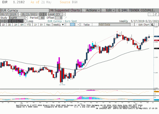 Geçtiğimiz hafta son beş işlem gününün dördünde 1.2250 seviyesine doğru yükselen parite bu seviyeyi geçmekte zorlandı. 1.2250 artık önemli bir sınır ve bu seviyenin aşılması ikinci raunt yükseliş hareketi anlamına geliyor. Geçtiğimiz haftanın son işlem gününde açıklanan Euro Bölgesi Mayıs ayı PMI imalat sanayi endeksi 62.8 servis sektörü PMI endeksi 55.1 olarak pozitif gerçekleşti. İngiltere PMI imalat ve servis sektör endekslerinin 60.00 seviyesi üzerinde iyileşmeyi sürdürdüğü görüldü. Pazartesi günü Avrupa ülkelerinde Almanya ve Fransa banka tatili nedeni ile kapalı olacak. Salı günü açıklanacak olan Alman IFO iş dünyası güven endeksinin 98.2 (önceki 96.8) olması bekleniyor. Aynı gün açıklanacak Euro Bölgesi ilk çeyrek büyüme rakamı %1.7 daralmayı işaret etse de bu durumun öncesinde fiyatlanmış olduğunu biliyoruz. Mayıs-Ağustos dönemi verilerinde aşılama ile gelen normal ekonomik aktivite ve iyileşen ekonomik veriler ile Euro’nun değer kazanımı sürebilir. Ancak kısa dönemde enflasyonu ve otoritelerin olası tepkisini anlamaya çalışan döviz piyasası Euro iyimser fiyatlamanın devamı için zorlanıyor.