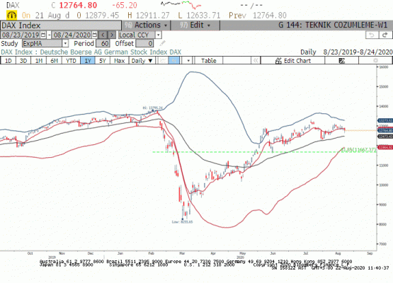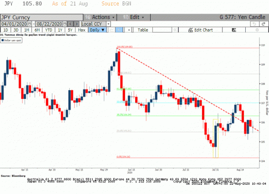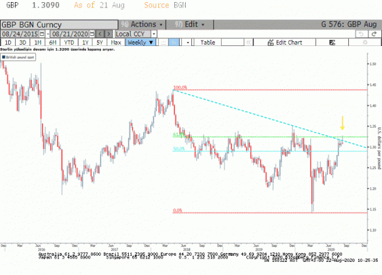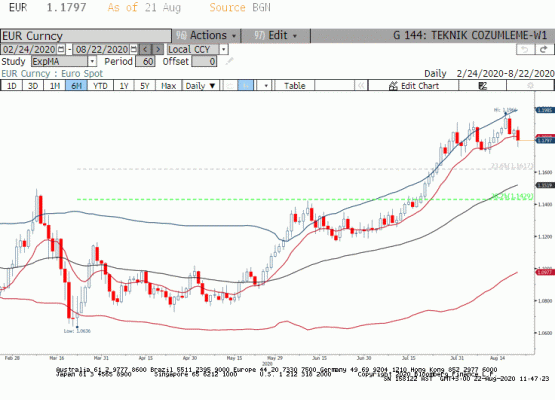 GBPUSD Paritesi: İngiltere tarafında takip edilen virüs vaka sayısı ve Brexit görüşmelerinden umut ettiği desteği bulamayan Sterlin değer kaybetti. Temmuz ayı verilerinde tüketici fiyat endeksi %0.4 (beklenti -%0.1) artış gösterirken yıllık enflasyon %1.0 seviyesine yükseldi. Çekirdek tüfe artışının da %1.8 ile beklenti olan %1.2 üzerinde olduğu görülüyor. Önemli bir ayrıntı 2 trilyon Sterlin ile GSYIH'ın %100 üne ulaşan borçluluk oranı ve 1960 yılından bu yana görülen en ağır yük. Bu hafta ortasında hafta ortasında yapılacak 10 yıllık tahvil ihalesi dışında takvimde bir veri bulunmuyor. Ancak hafatnın ikinci yarısında başlayacak olan Jackson Hole toplantısı ve Cuma günü BOE Başkanı Bailey konuşması öne çıkıyor.