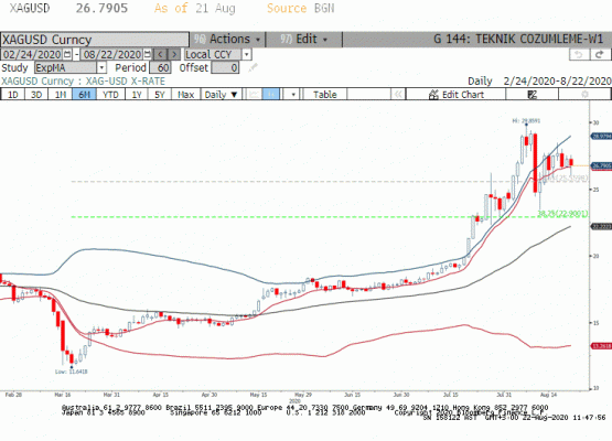 Teknik olarak; Kısa vadede 26.20 ve 25.50 dolar destek iken iki hafta önce 30.00 dolara doğru hareket ardından başlayan düzeltme haraketinin uzaması durumunda 23.00 dolara doğru geri çekilme yaşanabilir. Bu hafta 25.50 dolar üzerinde kalacak gücü bulan bir gümüş piyasası için 28.00 doların hedef olacağını düşünüyoruz. 29 ve 07 Ağustos yükseği 29.85 dolar sonraki direnç seviyeleri iken kısa vadede 25.50-28.00 dolar aralığının kırılma yönünü önemsiyoruz.