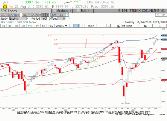 S&P500 Endeksi; Geçtiğimiz hafta açıklanan ekonomik verilerde haftalık işsizlik maaşı başvuruları 1.1 milyon ile beklenti üzerinde gerçekleşti. İkinci teşvik paketi ve FED desteği olmadan aşısız bir sürecin etkilerinin istihdam başta olmak üzere ekonomik verilerde bozulma yaratacağı endişesi var. Öte yanda Temmuz ayında mevcut konut satışları düşen konut kredilerinden aldığı destek ile ikiye katladı. Piyasada ortalama satış süresinin 22 güne gerilemiş olması da gayet olumlu diyebiliriz. Otomotiv sektöründeki canlanma da gözden kaçmıyor. Öte yanda zayıf doların US hisse senetlerine olan talebi artırdığı tezi var. Bazı stratejistler ise gelişen ülke hisse senetlerinin göreceli ucuz olduğunu ve önümüzdeki aylarda ABD hisse senetlerinden gelişen ülkelere kayış olabileceğini düşünüyor. Karışık ekonomik verilere rağmen geçtiğimiz hafta yaşanan alımlara karşı zayıf trendini sürdürmesi beklenen Dolar Endeksi ve Apple hisse senedi olumlu performansı ile SPX yükselişini sürdürdü.
