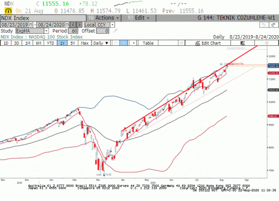 Nasdaq Endeksi: Teknoloji hisselerinin muhteşem performansı devam ediyor. Geçtiğimiz haftalarda şimdilik sürpriz gibi görünen erken bir aşı haberi ile teknoloji hisse senetlerinden dönemsel hisse senetlerine geçiş olabilir. Bu durum SPX endeksinin biraz daha iyi performans göstermesi anlamına gelirdi. Ancak henüz bir aşı haberi yok ve çağımızın konsepti teknoloji olduğundan bu sektörün taşıyıcı olmasına şaşırmıyoruz. Görünen o ki ikinci dalga endişesinin piyasa etkisi zayıfladı. Zayıf dolar desteği ile deniz aşırı ABD hisse senedi talebi sürecek ise teknolojinin cazibesi devam ediyor olacak.