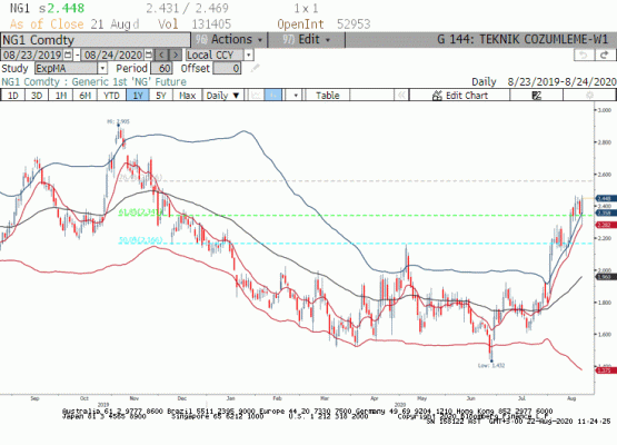 Doğalgaz Piyasası; Bir önceki hafta ABD Gulf bölgesinde sistemde gözlenen iki fırtına arz yönünde endişeler ile doğalgaz fiyatlarını yukarı taşıdı. Geçtiğimiz hafta Amerika Doğu'da tırmanan hava sıcaklığı ve artması muhtemel güç santralleri talebi ile doğalgaz fiyatları destek buldu. Ayrıca Eylül vadeli opsiyonların vade sonu olduğunda bu anlamda da bir pozisyon değişimi ile hareketlilik yaşandı. Doğalgaz piyasasında net uzun pozisyon miktarı son 52 haftanın rekor seviyesinde iken yılın geri kalanında yüksek doğalgaz fiyatları için piyasa sert bir kışa umut bağlamış görünüyor. Soğuk hava koşulları beklentisinin karşılanmadığı senaryoda doğalgaz fiyatları yönünü aşağı çevirebilir. Kısa vadede piyasada aşağı yönlü bir düzeltme bekliyoruz. Bu düzeltmenin alım fırsatı olarak görülüp görülmeyeceği konusuna gelince karar vermek zaman alabilir.